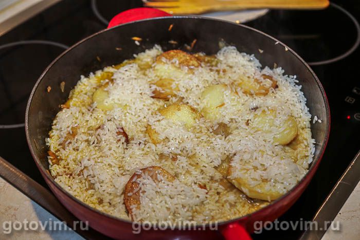 Залить рис с картошкой и колбасками питьевой водой, чтобы она полностью покрывала рис. Уровень воды должен на 1 см превышать уровень риса. Прикрыть сковороду крышкой, дать воде закипеть и уменьшить нагрев до минимального. Готовить плов с картофелем и колбасками примерно 15 минут, пока вода полностью не впитается в рис, и он не пропарится до готовности.