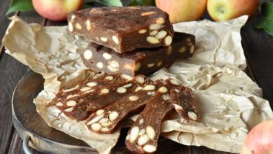 Снимите верхнюю тарелку и пленку. Украсьте миндалем и подавайте.