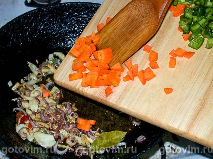 Добавить в сковороду перец, томаты и морковь, перемешать и влить стакан бульона.