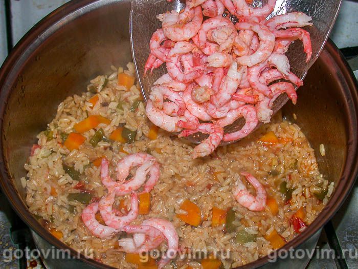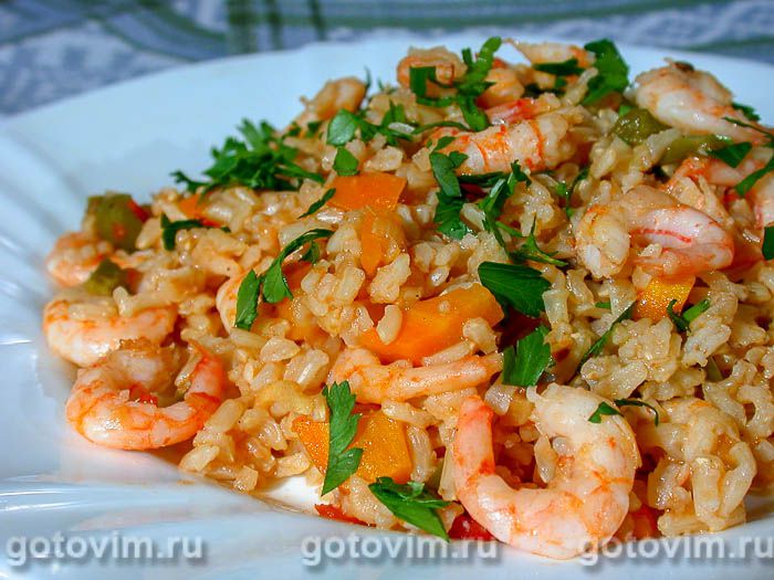 Теперь добавьте креветки. Но не перемешивайте. Оставьте под крышкой примерно на 3 минуты. В это время порубите зелень. Готовый рис перемешайте с креветками и зеленью и разложите по тарелками. Напомним, что время варки риса во многом зависит от сорта. Например, бурый рис, будет готовиться дольше, следовательно, количество бульона вам придется вымерять самостоятельно.