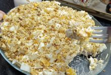 Шаг 11. Сверху наше угощение посыпаем тертым отварным яйцом. Убираем заготовку в холодильник для пропитки.