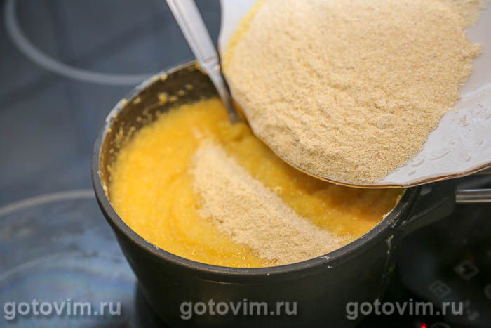 Когда крупинки в каше станут совсем мягкие, можно засыпать муку мелкого помол.