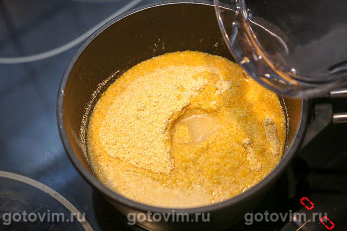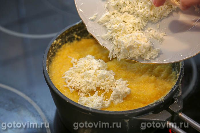Сначала в кастрюлю с толстым дном (оптимально казан) высыпать кукурузную муку крупного помола, влить холодную воду и, размешивая, довести смесь до кипения. Уменьшить огонь и варить, постоянно помешивая, около 30 (!) минут. Добавлять или не добавлять соль, решайте в зависимости от солености сыра. Каша будет вязкой, и смачно попыхивать при помешивании.