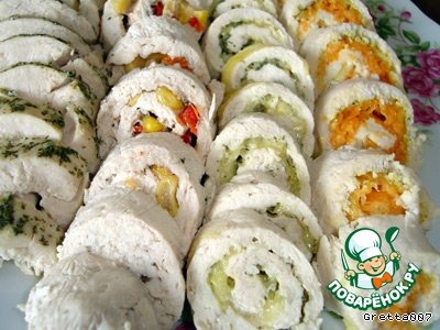 Давно хотела опробовать способ приготовления куриных грудок «в вакууме», описанный в старой «Школе гастронома». Но пошла дальше… приготовила еще и рулетики.