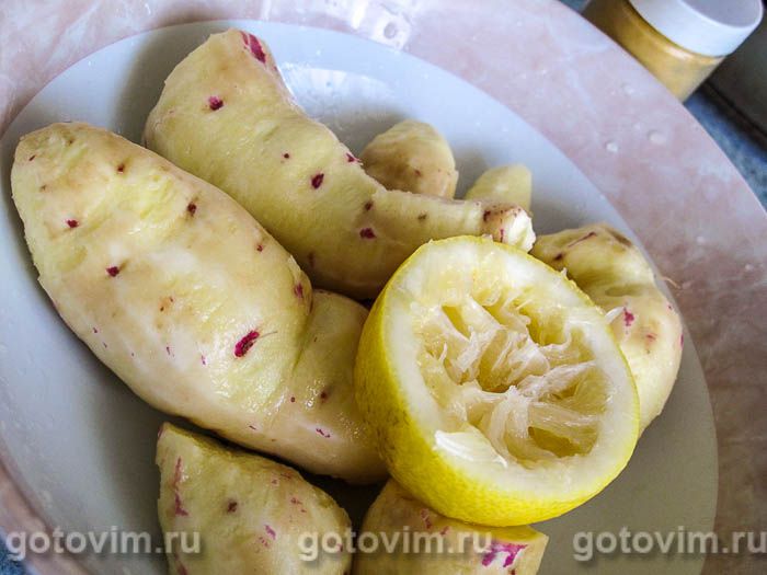 Батат скоблим ножом, если молодой можно оставить частички кожицы на клубнях. Если старый — чистим полностью, поливаем соком 1-го лимона.