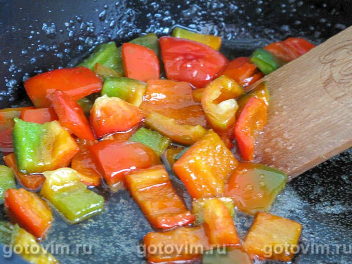 Разогреваем в сковородке масло примерно 4-5 ст.л.растительного и 2 ст.л.сливочного, слегка пассеруем подготовленный перец, всыпаем сахар и немного прогреваем.