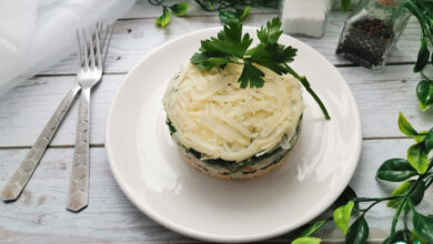 Наверное, это самый простой и беспроигрышный вариант блинного торта с сытной начинкой из жареных грибов и тертого сыра. Грибы можно измельчить в блендере или оставить кусочками, как вам больше нравится. Некоторые слои можно дополнительно промазывать майонезом или сметаной. Но и без них получится сочно.