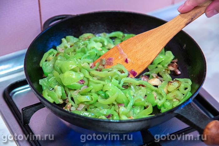 Растопить кусочек сливочного масло и пассеровать на нем тонко нарезанные луковички молодого лука. Затем добавить нарезанный полосками перец и пассеровать его, помешивая, пару минут. Перец за это время успеет посветлеть и станет мягче.