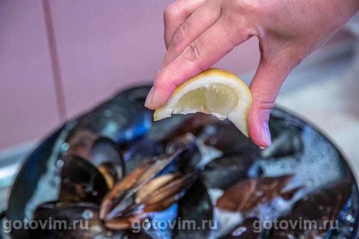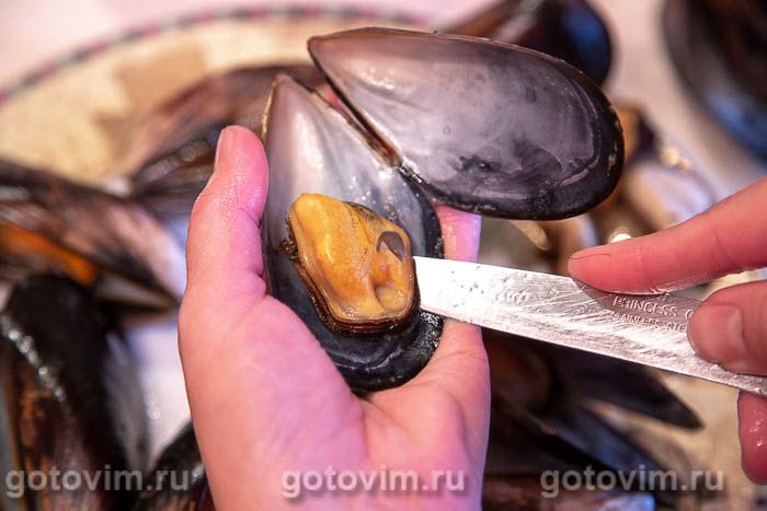 Мидии промыть под проточной водой, потереть щеточкой и срезать водоросли в месте прикрепления моллюска к субстрату.