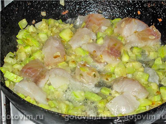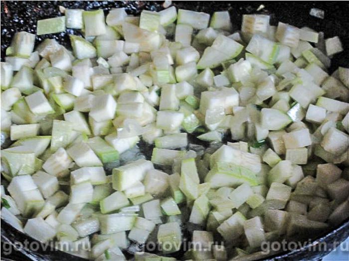 Лук чистим, измельчаем ножом, бросаем в разогретое масло. Пока пассеруется лук, нарезаем кубиками молодой кабачок вместе со шкуркой. Добавляем к луку.
