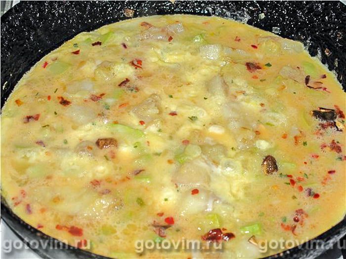 Взбиваем яйца вилочкой, добавляем к яйцам специи по вкусу и выливаем в сковородку. К этому времени вся влага выпарилась. Теперь немного убавляем огонь.