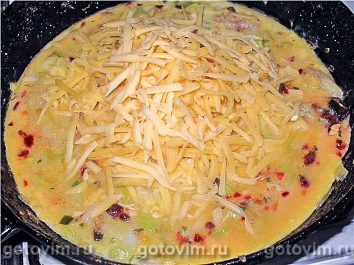 Как только омлет начал схватываться снизу, надо посыпать его тёртым сыром и сразу ставить в очень горячую духовку минут на 5-10. Фриттата с рыбой и овощами готова.
