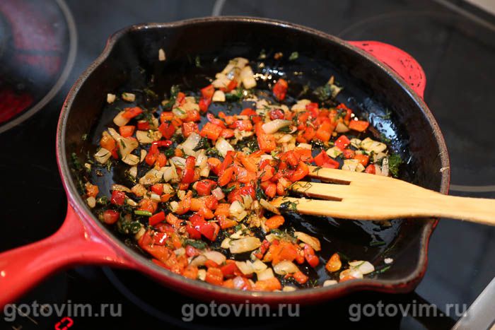 В глубокой сковороде разогреть растительное масло и добавить лук с перцем. Пассеровать на небольшом огне, пока овощи не станут мягкими.