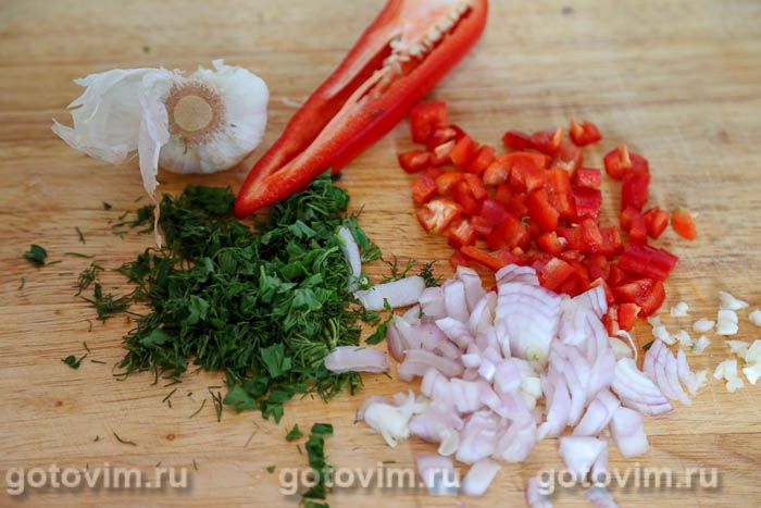 Овощи и зелень вымыть, обсушить на полотенце. Сладкий перец разрезать пополам, вычистить семена и нарезать небольшими кубиками. Лук и зелень мелко порубить.