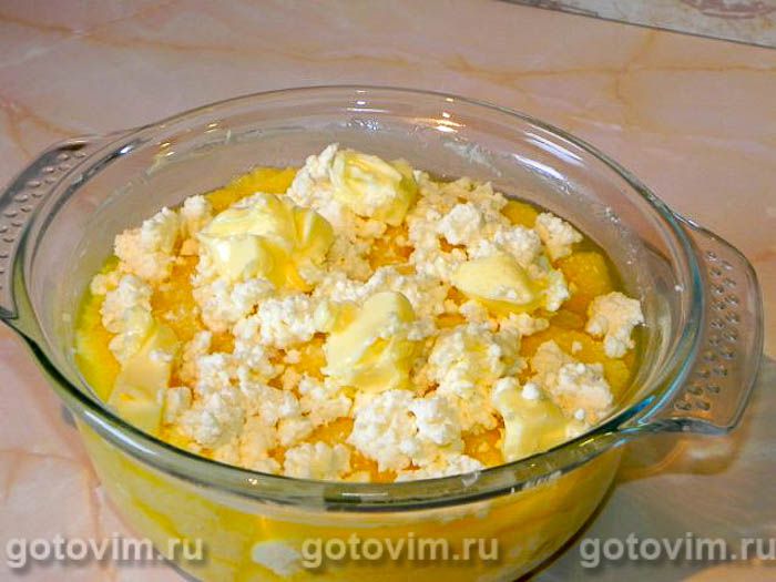 Затем положим еще слой каши, затем сыра и масла. Продолжаем чередовать слоя так, чтобы сверху оказался слой сыра.