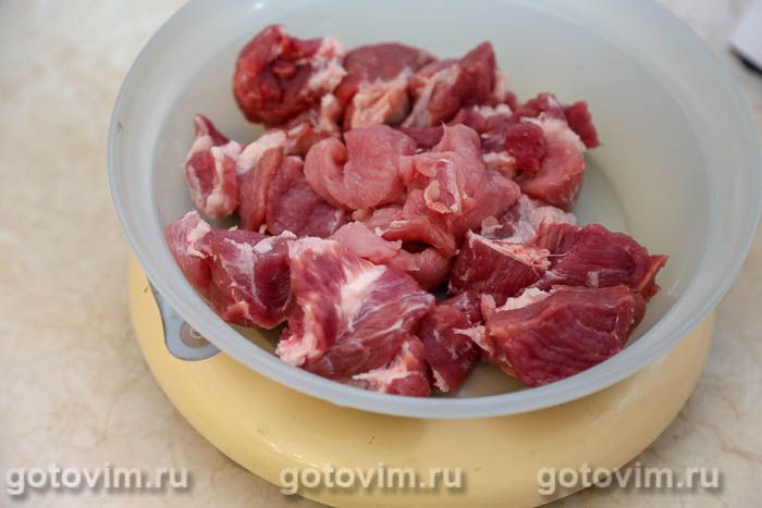 Мякоть свинины (вместо неё можно взять курицу или индейку) нарезать небольшими кусочками.