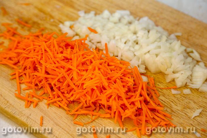 Лук очистить и мелко порубить. Морковь вымыть, очистить и порезать соломкой (или натереть на терке для корейской моркови). Чеснок почистить и измельчить.