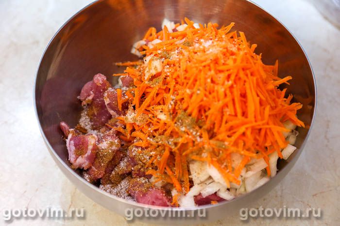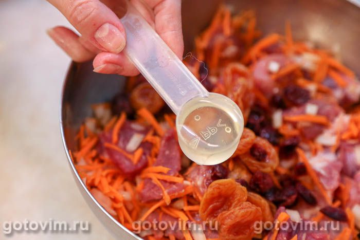 В миске смешать мясо с овощами, чесноком и сухофруктами. Посолить, поперчить, посыпать кумином. Перемешать
