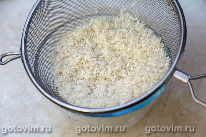 Подготовить рис для плова заранее. Несколько раз промыть его в холодной воде, пока вода не останется прозрачной, переложить в миску, снова залить холодной водой и оставить на 40 минут. Спустя 40 минут откинуть рис на металлическое сито и дать воде полностью стечь.
