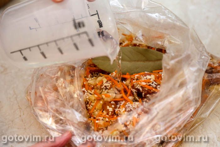 Теперь можно пересыпать эту смесь в рукав для запекания. Добавить туда лавровый лист и залить питьевой водой. Завязать рукав, сделать сверху маленький надрез, чтобы рукав не лопнул.
