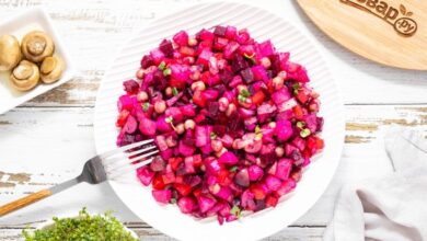 В миске смешать мясо с овощами, чесноком и сухофруктами. Посолить, поперчить, посыпать кумином. Перемешать