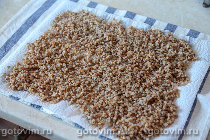 Переложить набухшую гречку на кухонное полотенце, застеленное бумажными полотенцами. Дать излишкам воды впитаться в полотенце, сменяя бумажное полотенце несколько раз.
