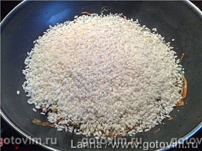 Присолила, перемешала и всыпала рис. Дала пару минут рису прогреться, и залила горячим бульоном.
