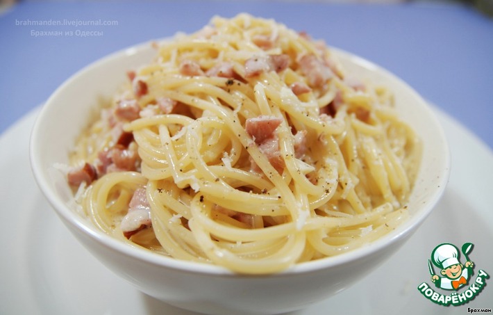 — Откидываем спагетти на дуршлаг и тут же возвращаем в еще горячую кастрюлю. Забрасываем грудинку с чесноком и сливочно-сырную смесь. Закрываем крышку и несколько раз встряхиваем. Или просто перемешиваем. Если все правильно и быстро сделать, не будет комков и соус получится однородный и позитивный.