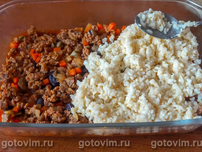 Поверх начинки из фарша и овощей выкладываем рисовую смесь.