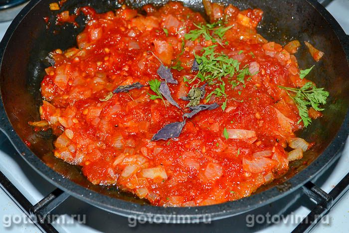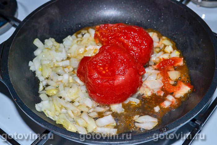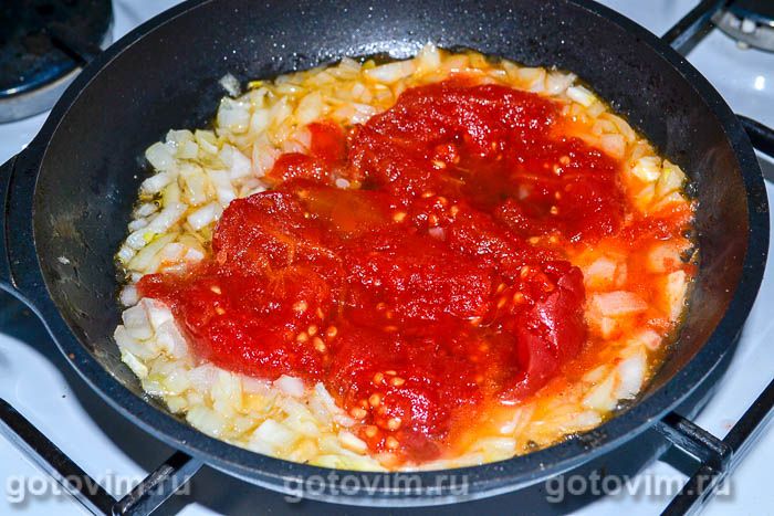 Разомните ложкой помидоры и обжаривайте их с луком до выпаривания жидкости.