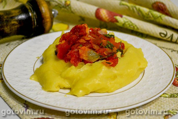 Густую кукурузную кашу поленту можно подать с домашним томатным соусом, который придаст готовому блюду средиземноморскую нотку. Вариантов соусов к поленте несколько. Пока остановимся на просто рецепте: достаточно потушить нарезанные кусочками консервированные помидоры с мелко нарезанным репчатым луком и приправить пряными травами (базиликом и петрушкой).