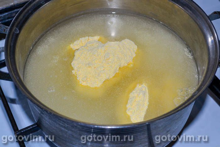 Влейте воду в кастрюльку и включите плиту. Сразу же засыпьте муку в холодную воду и венчиком хорошо размешайте во избежание образования комочков. Всыпьте соль.