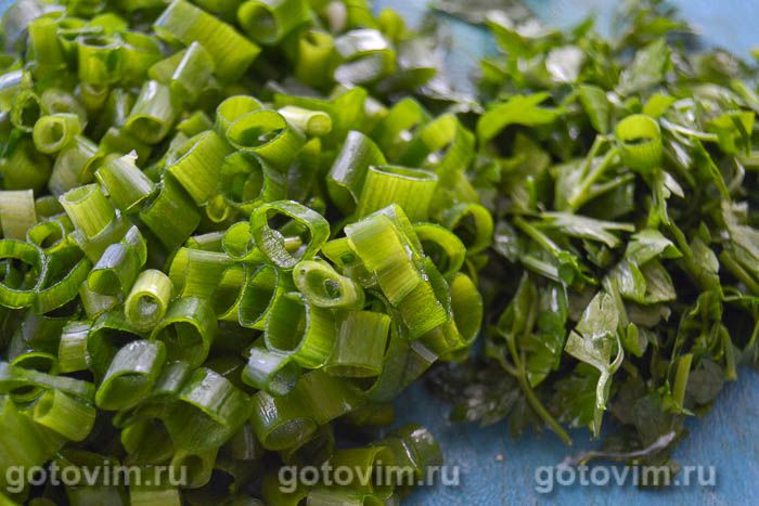 Порубите свежую зелень. Часть отправится к рису с мясом, а остальное оставьте для украшения готового блюда.