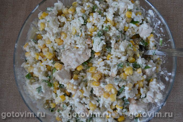 Смешайте в миске все ингредиенты. Переложите в огнеупорную форму или на противень и отправьте в разогретую до 180-200С духовку на 15-20 минут. Готовый рис, запеченный с курицей, зеленым горошком и кукурузой разложите по тарелкам, украсьте зеленью и можно подавать на стол. Приятного аппетита!