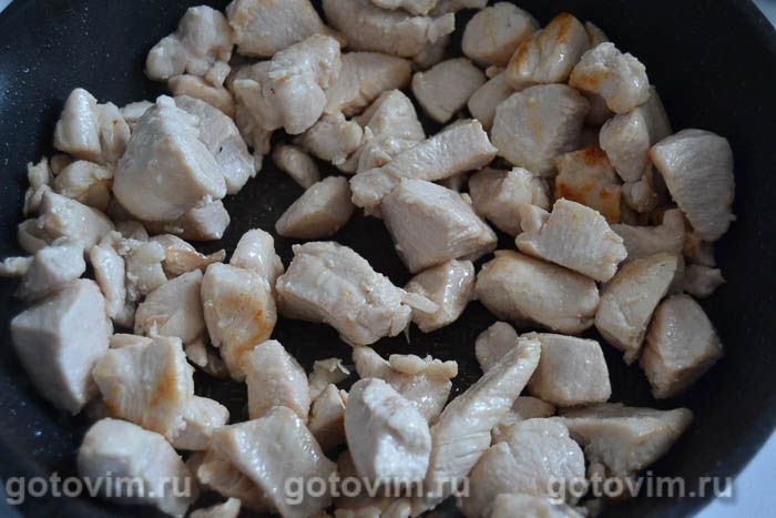 Разогрейте в сковородке примерно 1 ст.л. растительного масла, добавьте мясо и обжаривайте, помешивая лопаткой, на сильном огне до румяной корочки. Жарить до готовности не надо, а только, чтобы запечатать в мясных кусочках сок, тогда курица получится сочной. Соль и перец добавить в конце жарки.