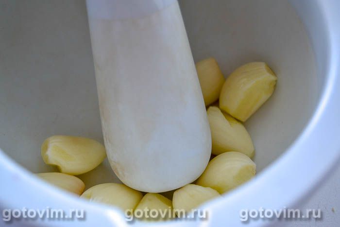 А пока, почистите чеснок и измельчите удобным вам способом. Например, пестиком в ступке.