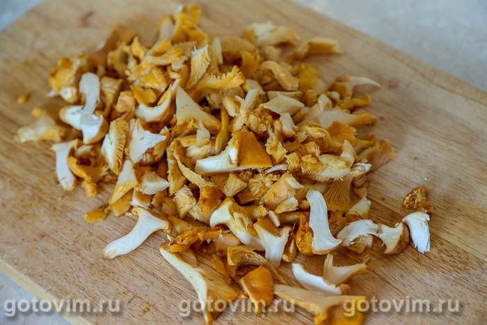 Когда с лисичек стечет вода, крупные грибы нарезать на 2-4 части.