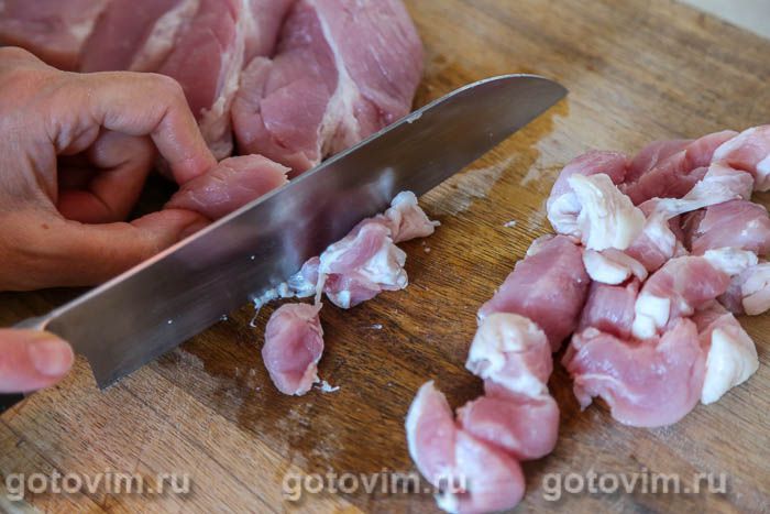 Свинину ополоснуть под проточной холодной водой, обсушить на бумажном полотенце и нарезать не толсто, кубиками или брусочками.