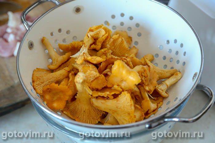 Лисички перебрать, промыть в холодной воде и откинуть на дуршлаг.