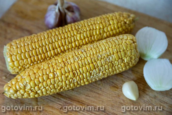 Очистить кукурузные початки. То же самое проделать с луком и чесноком.