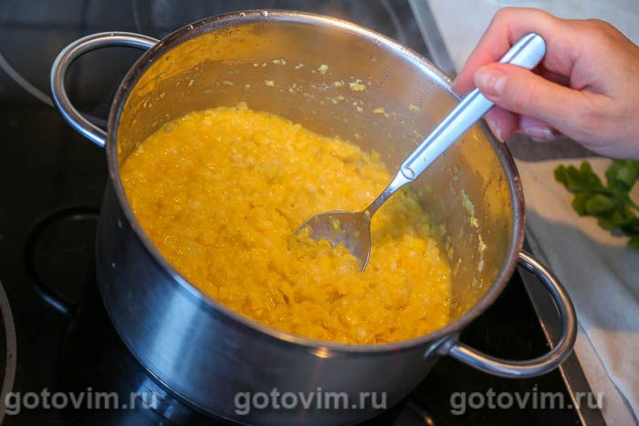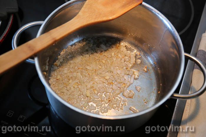 В кастрюле или сотейнике разогреть растительное масло. Добавить лук с чесноком и пассеровать, помешивая лопаткой, пока лук не станет прозрачным и мягким.