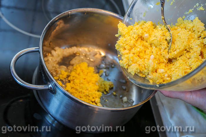 Переложить к луку измельченную кукурузу. Посолить, поперчить, хорошо перемешать. Готовить на слабом огне, помешивая, 1-2 минуты. После этого влить примерно полстакана холодной воды, накрыть крышкой и продолжить готовить кукурузную кашу еще примерно 10 минут под крышкой.