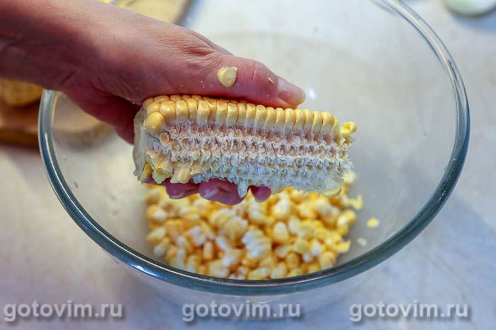 Отделить кукурузные зерна. В некоторых рецептах предлагают сразу натирать кукурузу на крупной терке, но тогда часть зерна останется на кочерыжке, а это не гуд. Поэтому нудно и методично отколупываем зерна. Еще раз повторю — кукурузу не варим, зерна сырые.