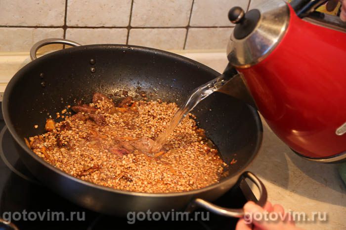 Залить горячей водой из чайника или горячим бульоном. Жидкость должна полностью покрывать содержимое сковороды. Накрыть сковороду крышкой, но не плотно, и готовить на слабом огне около 15 минут. За это время вся жидкость впитается в гречку.