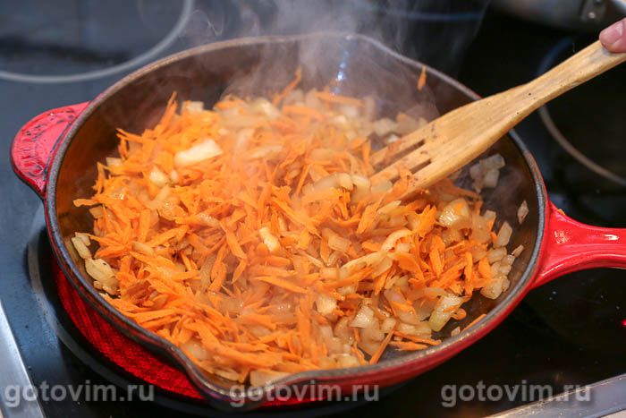 В глубокой сковороде разогреть 1-2 ст.л. растительного масла. Добавить измельченные овощи, уменьшить нагрев до среднего и пассеровать до мягкости моркови и прозрачности лука.