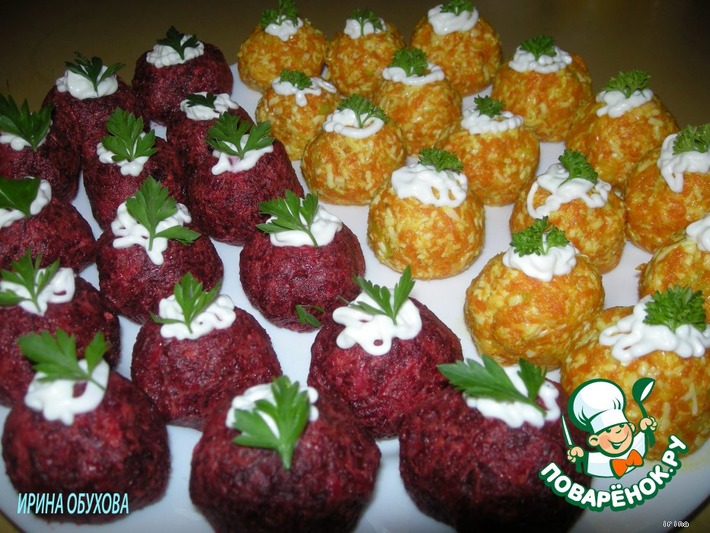 Свекольные шарики – свекла, сыр, желтки, селедка.