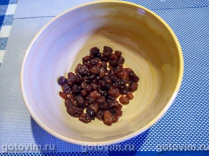 Изюм моем, заливаем кипятком и сразу отжимаем.