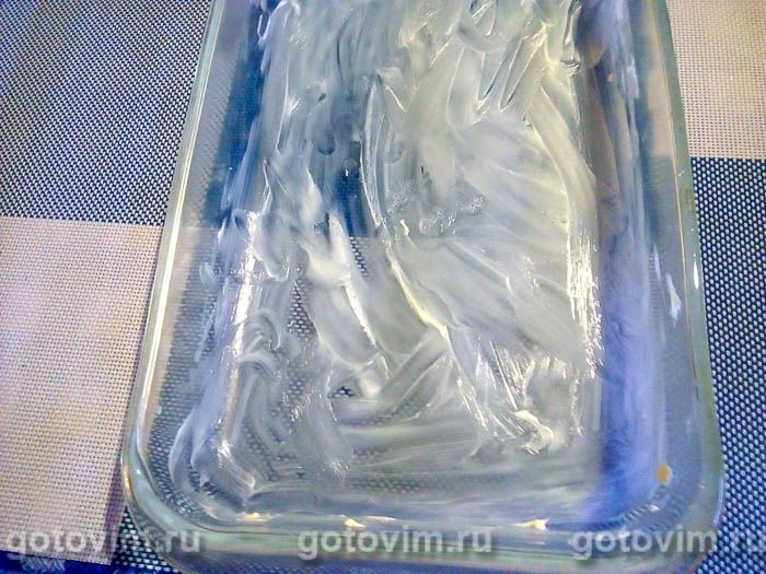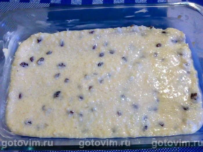В рисовую массу кладём изюм и сыплем манную крупу. Количество яиц и манки зависит непосредственно от количества оставшейся каши. Смазываем сливочным маслом подходящую по размеру форму, выкладываем туда будущую рисовую запеканку, разравниваем и ставим в духовку.
